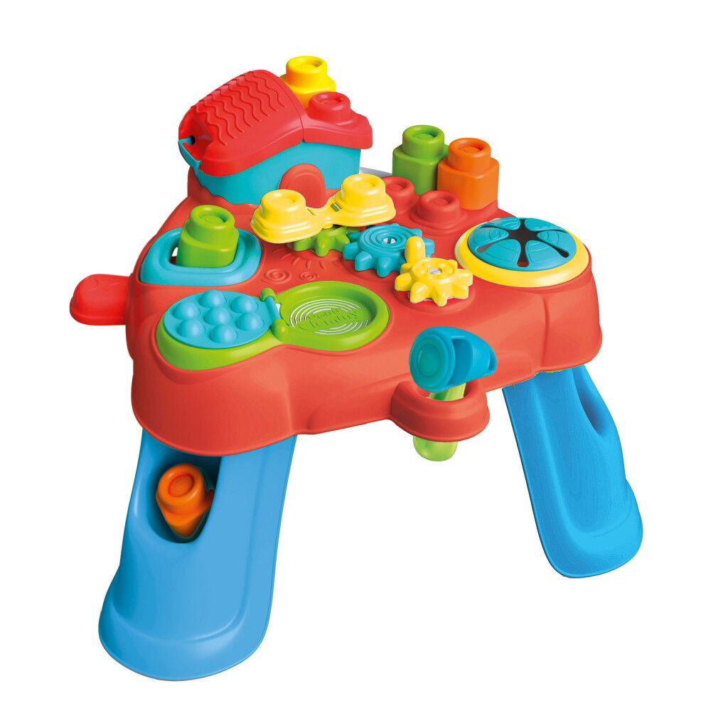 Het speelhuisje is een praktische bak voor zachte bakstenen en de gleuf in het dak is perfect om ze erin te stoppen. Het kind kan ze daarna weer pakken of stapelen. Een van de vele activiteiten is een katapult waarmee het kind de Clemmy bakstenen kan laten springen, terwijl de tandwielen de carrousel laten draaien waarop de bakstenen kunnen worden geplaatst. Dankzij de openingen kan het kind de Clemmy bakstenen in de holtes van de tafelpoten laten vallen en ze vervolgens weer pakken. Zo ontwikkelt het het begrip van de oorzaak-gevolgrelatie. Om de handvaardigheid te stimuleren is er een boekje met pop-it-activiteiten, en met de zachte hamer kan het kind met de katapult spelen of de Clemmy bakstenen makkelijker in de openingen doen. Een veelzijdig speelgoed voor de zintuiglijke ontwikkeling, dankzij reliëfoppervlakken met textuur en zachte inzetstukken. Perfect om staand mee te spelen, om het evenwicht en de motoriek te oefenen.