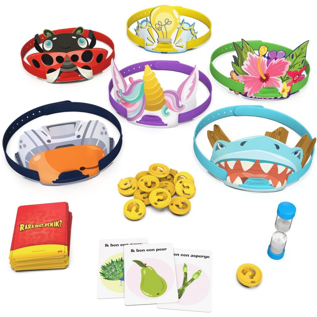 Dit Hedbanz-spel bevat 6 nieuwe Hedbanz: pilotenbril, eenhoorn, haai, lieveheersbeestje, gloeilamp en bloemen, plus 69 gloednieuwe kaartillustraties, zoals ‘Ik ben een brownie’ en ‘Ik ben een pauw’. Kies je favoriete hoofdband en pak een plaatjeskaart zonder naar het plaatje te kijken. Stel creatieve ja/nee-vragen om je kaart te raden in de categorieën dieren, voorwerpen en voedsel. Verzamel als eerste 3 scorebadges en win.